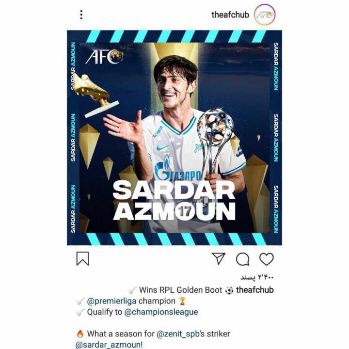 کنفدراسیون فوتبال آسیا از سردار آزمون، مهاجم تیم ملی ایران و زنیت روسیه تمجید کرد.