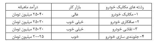 طبق جدول بالا رشته های مرتبط با مکانیک خودرو، بازار کار قابل قبول و پر رونقی داشته و افراد می توانند با توجه به میزان سواد، توانایی ها، تجربه کاری، درصد رضایت مشتری و تبلیغات به درآمد های متفاوتی برسند. اگر شما هم به رشته های مکانیک خودرو علاقه مندید، باید ابتدا حوزه فعالیت خود را نسبت به علاقه و شرایط کاری تان انتخاب کرده و سپس وارد بازار کسب و کار آن شوید.